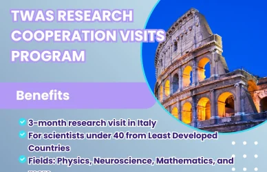 September 19, 2025 0 Comments TWAS-SISSA-Lincei Research Cooperation Visits ProgrammeThis programme offers early-career scientists from Least Developed Countries (LDCs) a 3-month research ... Read More