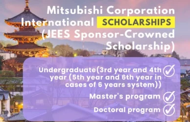 March 22, 2024 0 Comments JEES Scholarship (Japan Educational Exchanges and Services (JEES)) Mitsubishi Corperation International ScholarshipMitsubishi Corporation International Scholarship (JEES Sponsor-Crowned Scholarship) Organization Japan Educational Exchanges and Services ... Read More