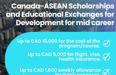 EduCanada (for International Scholarship program) Canada-ASEAN Scholarships andEducational Exchanges for Development (SEED) – for Mid-Career Professionals Profesional Karir Menengah dari Negara-Negara ASEAN